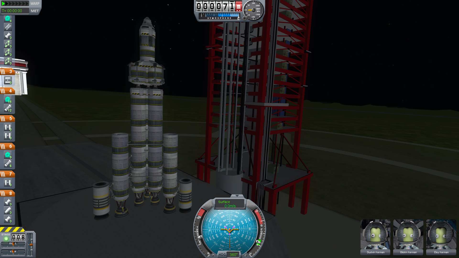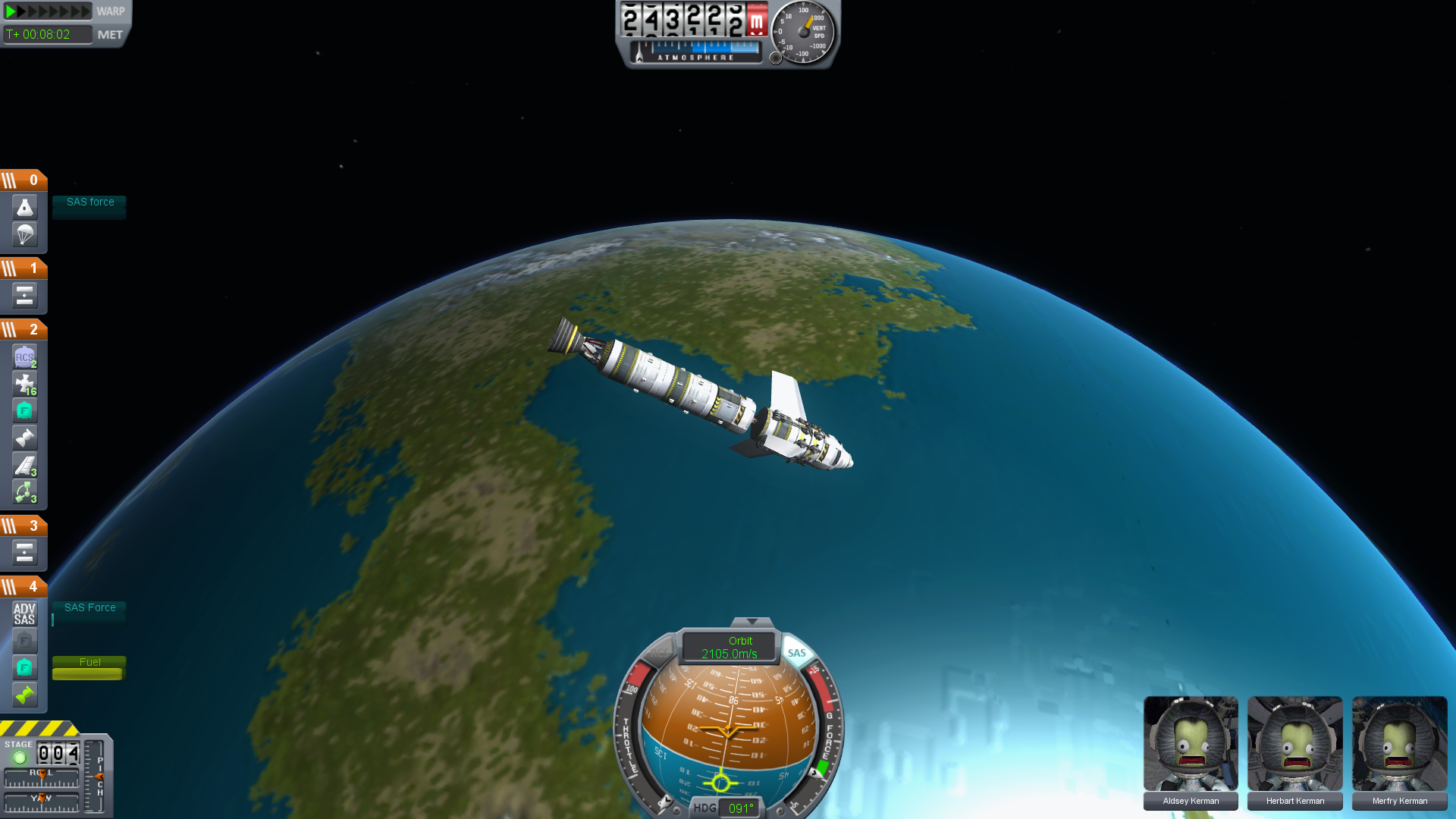 This craft came the closest yet to a Munar landing, shown here in orbit around Kerbin, it’s main stage and boosters already separated, waiting for the perfect time for Trans Munar Injection