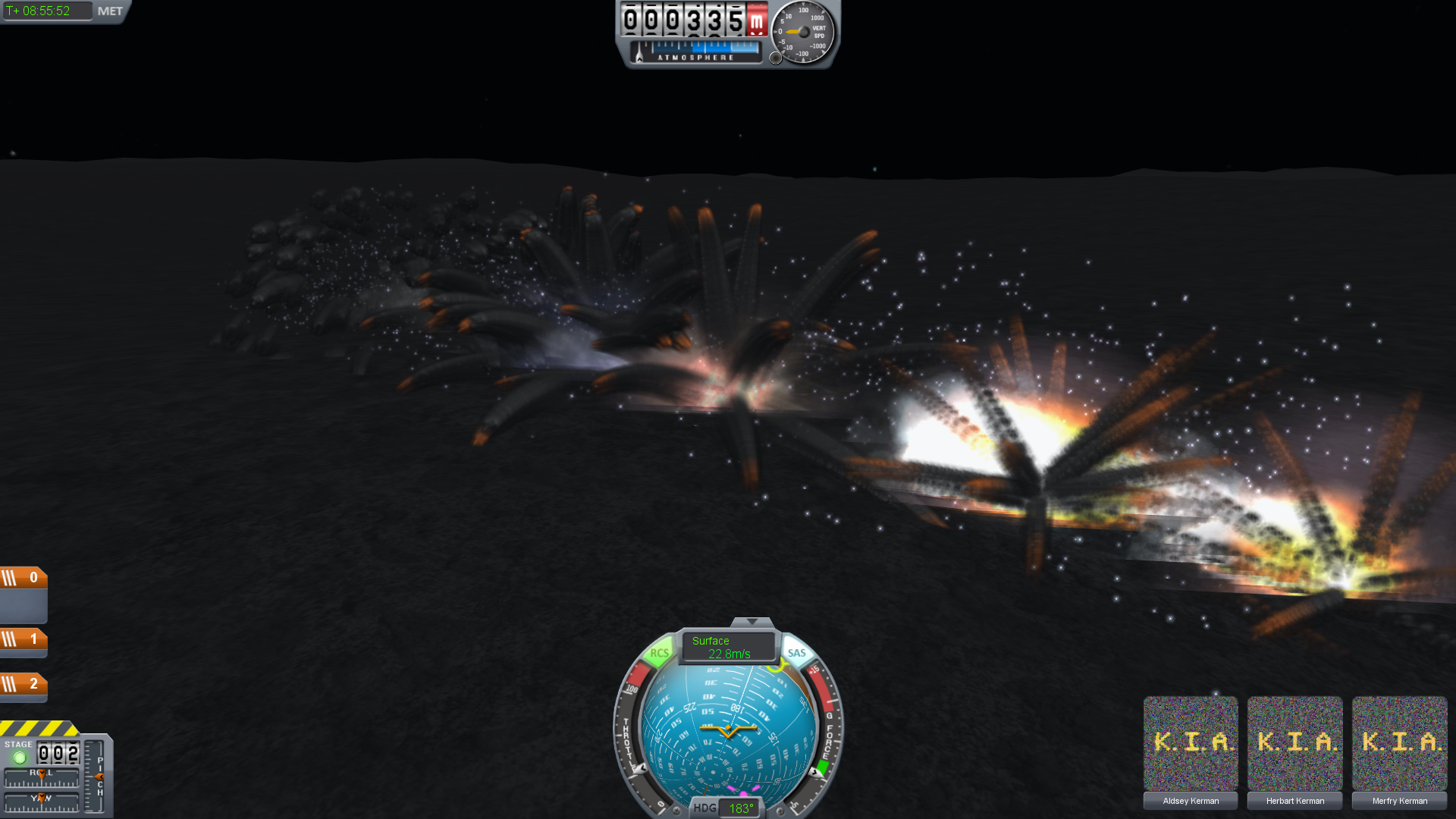 Sadly flying by instruments did not tell me just how much lateral motion I had, and my small and lightweight landing craft was not stable enough to be able to correct this easily. The Kerman family were notified