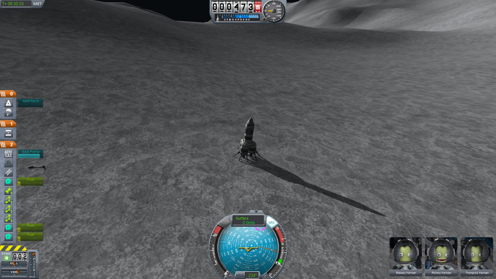 One small step for */csk/* Kerb, one giant leap for Kerbkind. I did break part of my landing gear during the impact, but I think that went quite well, this day and the names Bobsey, Richmy and Thomprick will go down in history.